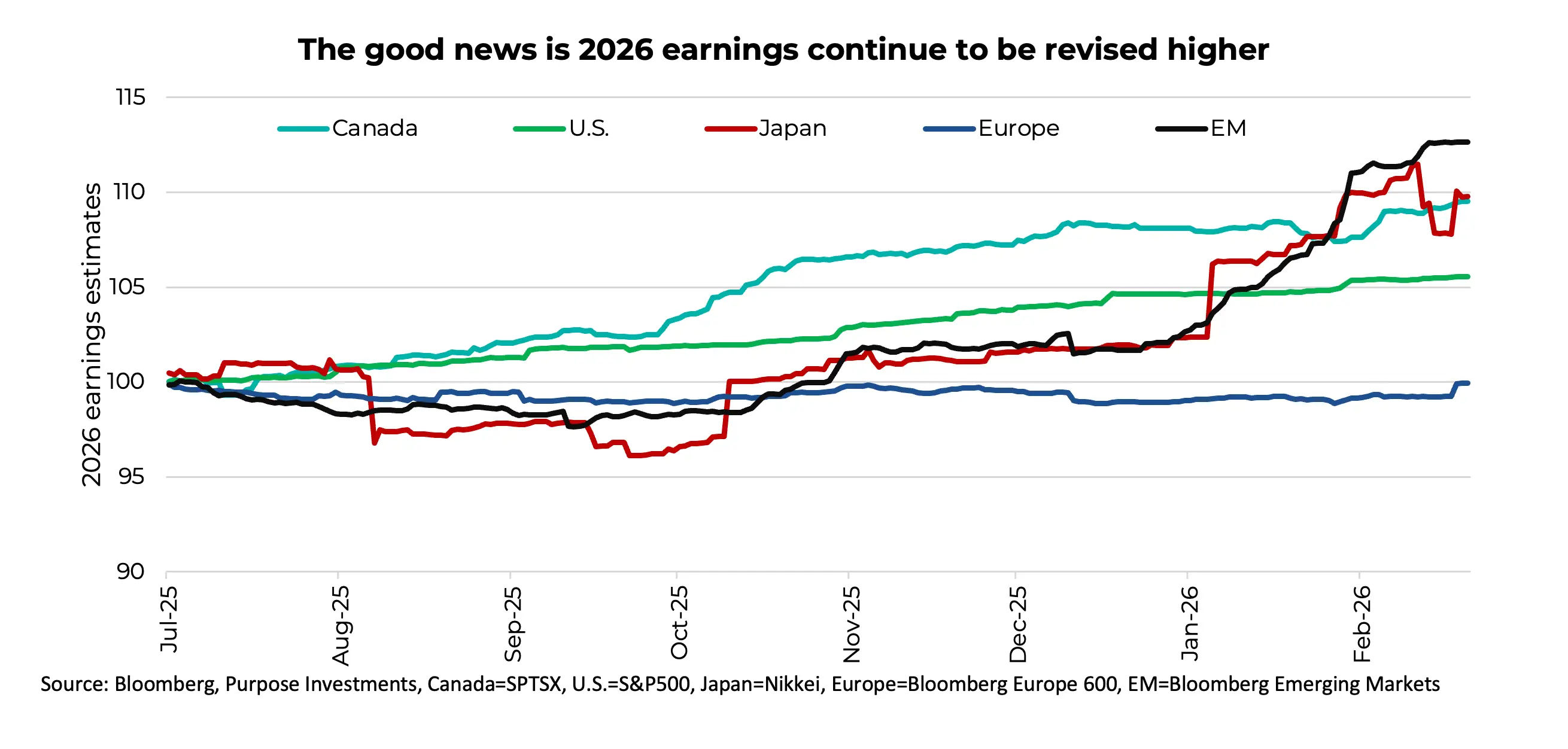 Estimates for 2026 calendar year earnings have risen by 12% for emerging markets (EM) since last summer. The TSX and Japan have also enjoyed strongly positive earnings revisions. And guess what are the best performing markets so far in 2026? Yep, Japan is at the top, followed by emerging markets and then the TSX. Europe and the U.S. are the laggards, still up but not nearly as much.