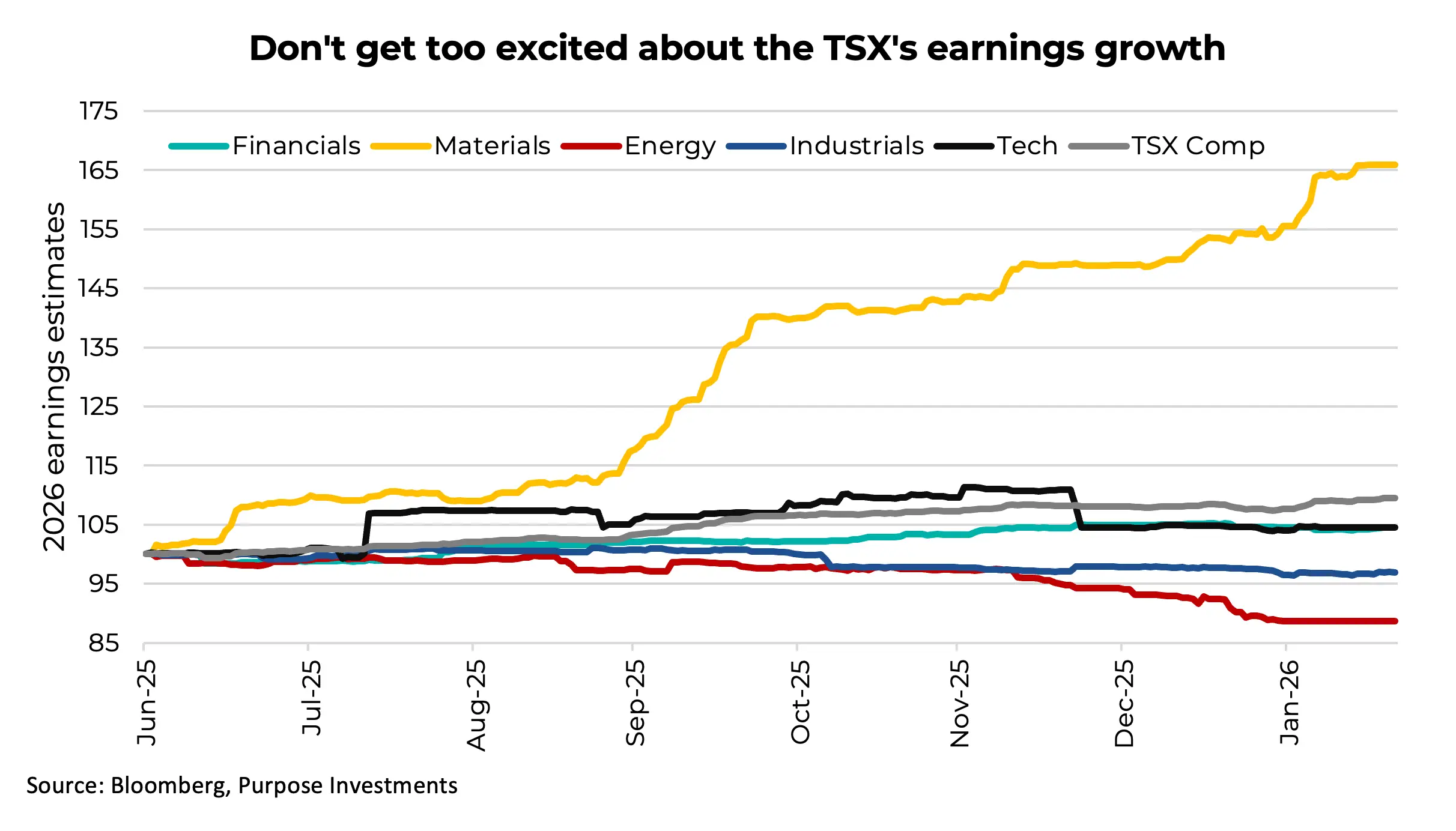 So is the place to be in 2026 Japan, emerging markets and the TSX? We believe it could be with the first two, but we’re a little less enthusiastic about the TSX, the reason being where that earnings growth is coming from. The chart below includes the overall TSX’s 2026 earnings revisions, and as you can see, it’s all coming from Materials, led by gold. No question, gold companies are printing a lot of cash flow. But the market may not pay up much for such volatile earnings.