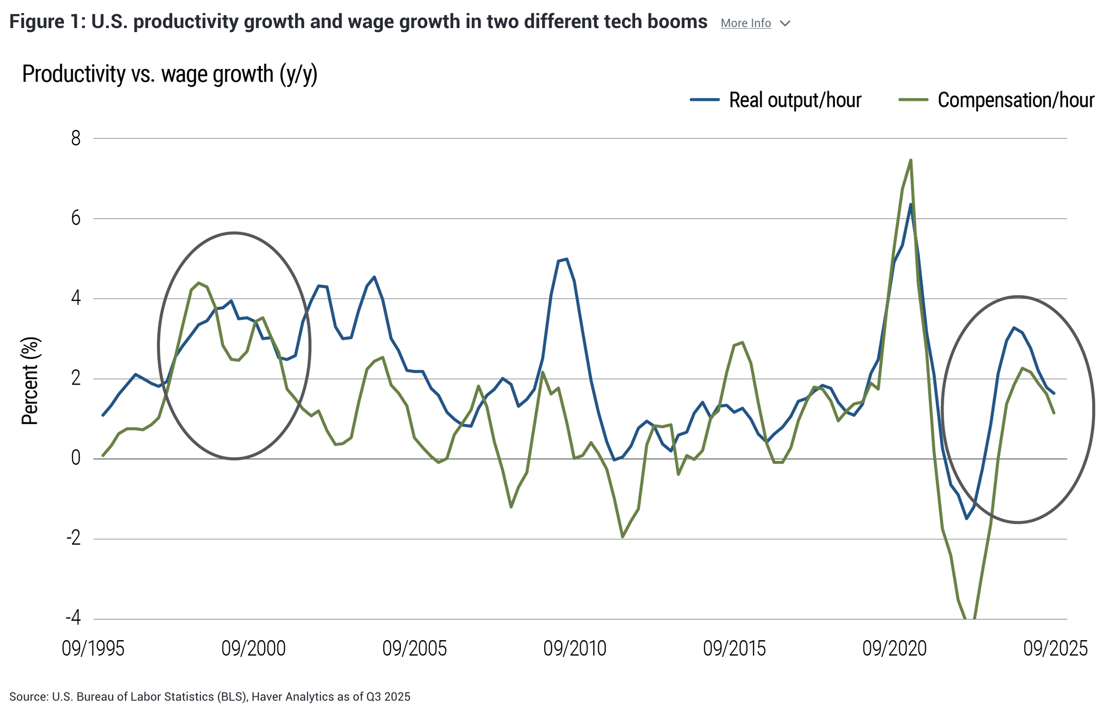 Given the uncertainty, comparisons to historical economic transformations that followed the introduction of general-purpose technologies are natural. Specifically, the late-1990s diffusion of personal computers, networking, and the internet, which drove a productivity boom, is a potentially useful study for today. However, there are important differences between the late 1990s and what is happening today. If 2025 is a preview, AI might not be a productivity tide that lifts all boats. Indeed, the risk is that much of the value AI creates will accrue primarily to capital holders – not workers.