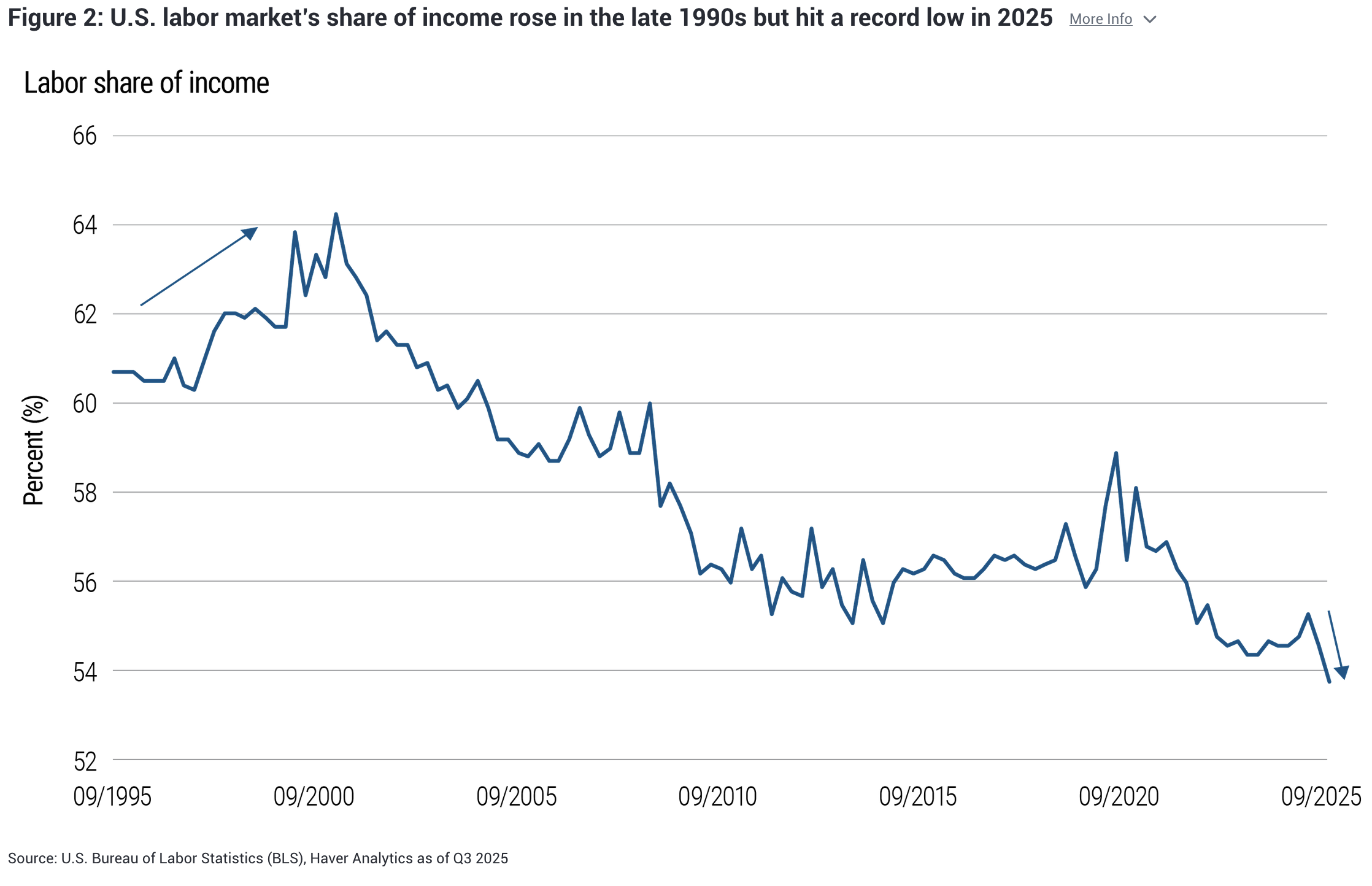 While an AI-led productivity boom could generate similar outcomes, the risk is that the economic adjustments seen in 2025 foreshadow more to come – that AI will likely create winners and losers, with capital holders the net winners. Although workers generally were more productive in 2025, labor’s share of income fell, and we may see more net labor displacement ahead.