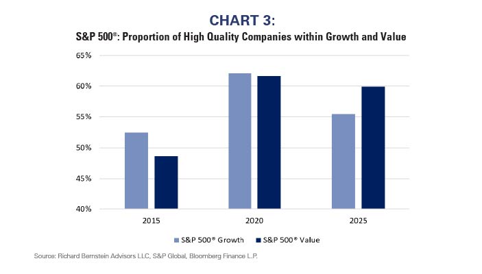 Chart 3 demonstrates that Growth contained a larger proportion of higher quality stocks than Value did in both 2015 and 2020, but today that has been reversed. About 60% of the Value universe is now comprised of higher quality companies.