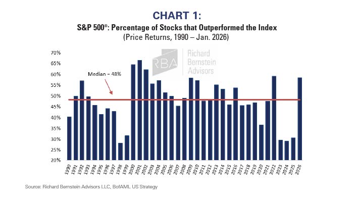 Chart 1 shows the percentage of stocks within the S&P 500® that outperformed the market by year. The period from 2023 to 2025 was the longest stretch of narrow leadership in the chart’s history. Leadership has finally begun to broaden in 2026.