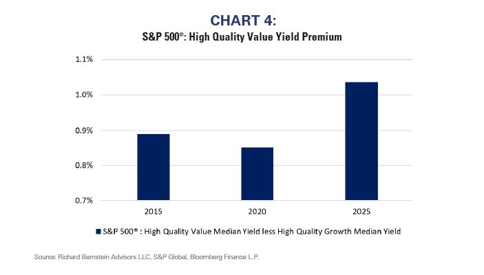 Because of the historically long period of narrow leadership, investors today do not have to decide between quality and dividends! Chart 4 shows that high quality stocks in the value universe currently have a meaningfully higher dividend yield than high quality stocks in the growth universe. Although there is generally a yield premium for value-oriented, higher-quality stocks, the premium is currently higher than it has been over the past decade.