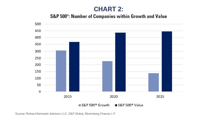 The extended period of narrow leadership has skewed the number of companies within the S&P 500® Growth and Value Indices. Chart 2 highlights that in 2015 roughly 300 S&P 500® companies were in the Growth Index (Note: companies can be in both indices so the combination of the Growth and Value indices will not sum to 500). By 2020, the number of growth companies had fallen to roughly 225. The narrow leadership of the past several years has led to under 140 companies in the current growth index.