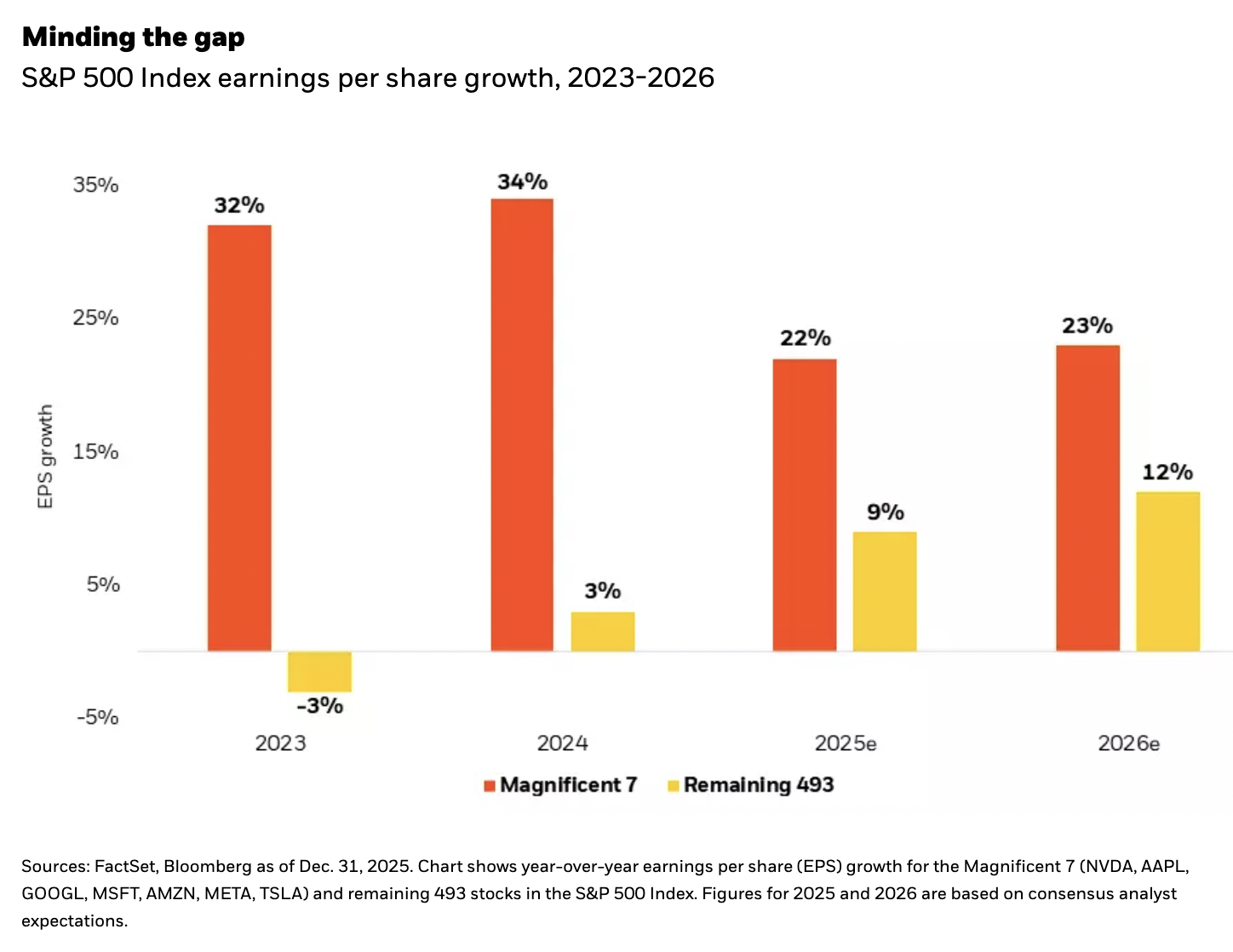 Analyst estimates point to a narrowing earnings growth gap between the Mag 7 and the rest of the market in 2026, as shown in the chart below. As a portfolio manager and active stock picker, Mr. Kanan sees this presenting opportunity to enter or add to positions in fundamentally sound (and some forgotten) companies at undemanding valuations.