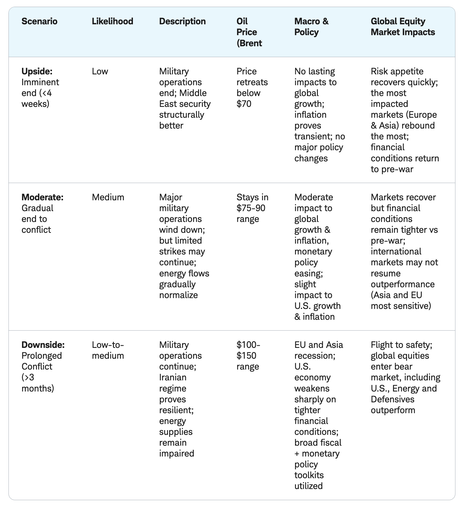 We are tracking the Iran war and potential economic and market outcomes via a scenario analysis that has three potential outcomes—an upside case, a moderate case and a downside case. The scenario table below provides an assessment of the likelihood of each case, including details on the potential impact to equity markets. The upside case is defined by a quick end to military operations, with energy production and shipments normalizing and market pricing returning toward pre-conflict levels. We see the likelihood of this case as reduced given the worsening conflict and disruptions to energy and commodity supplies.