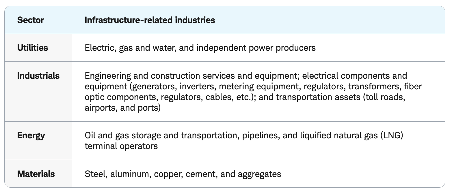 Investors can find both individual companies and mutual funds or ETFs that focus on infrastructure. Infrastructure funds generally allocate to industries across the following sectors to varying degrees: