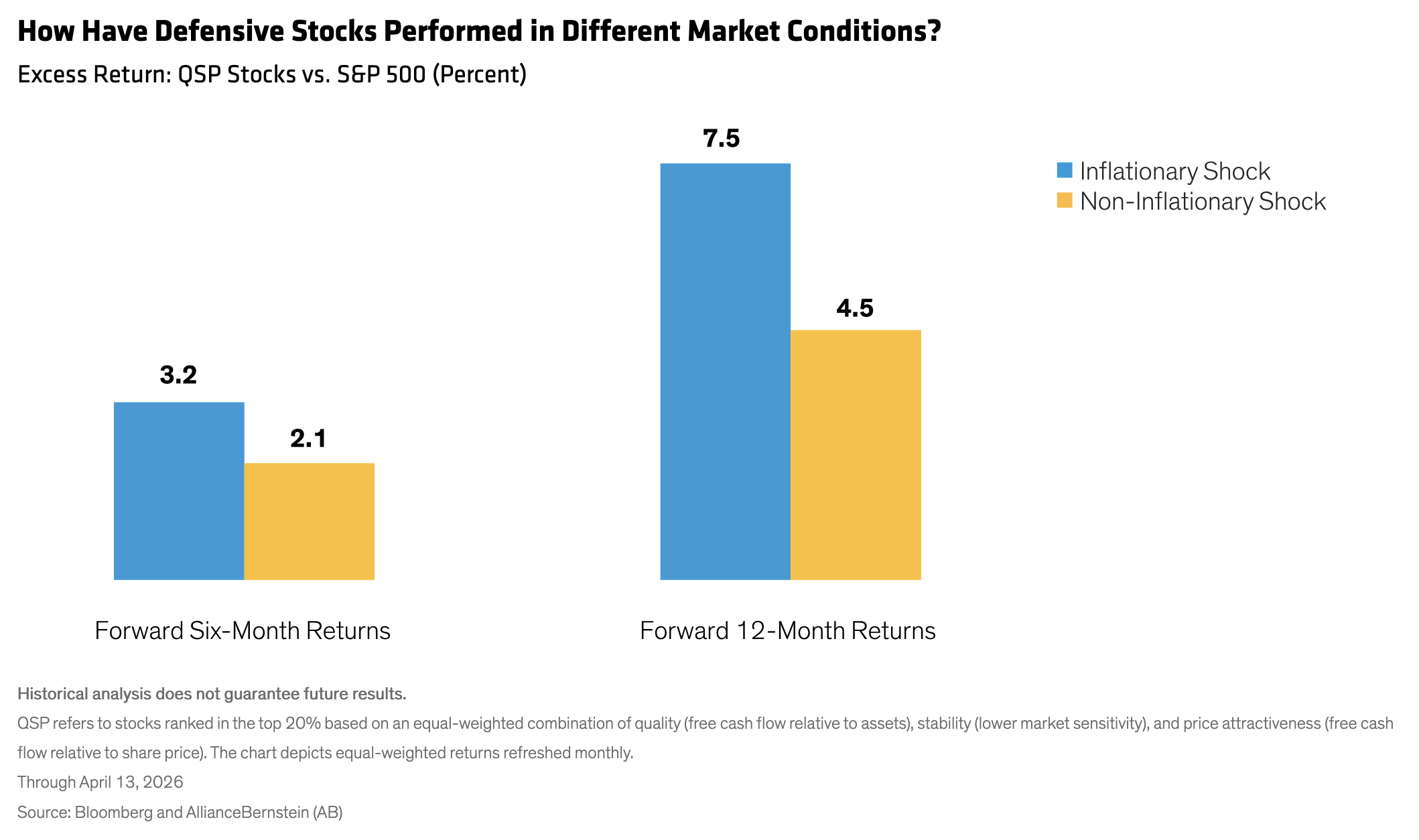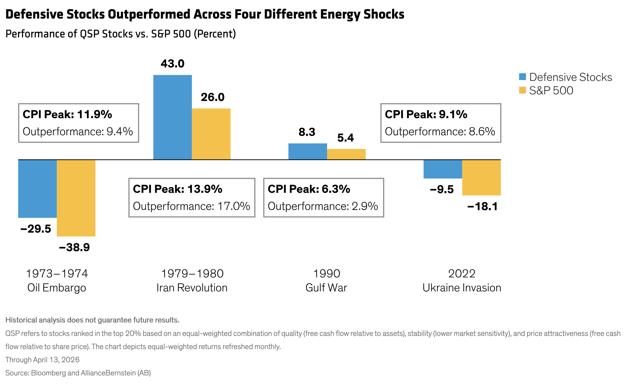 Equity markets have come under pressure amid growing concerns about the conflict in Iran and its effects on energy prices and inflation. For investors seeking refuge from volatility and rising prices, a defensive posture may provide some relief. In fact, our research suggests that defensive stocks have outpaced the broader market during every major energy shock since 1973.