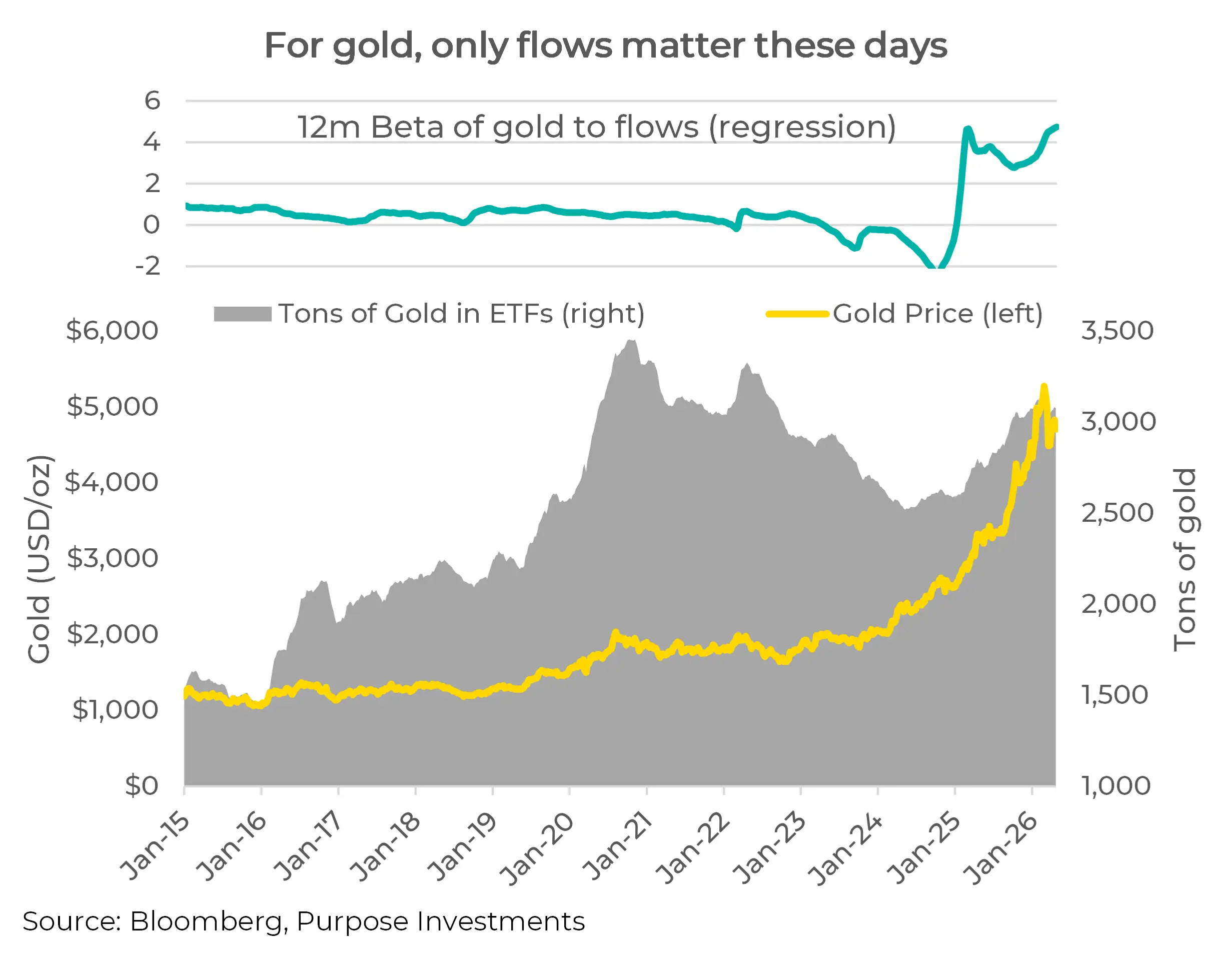 Central banks diversifying their reserves, mildly bearish sentiment towards the U.S. dollar, or other factors, probably got this bull run going. But like anything, once the performance started shining the floodgates opened with more investors piling in. How many investors started asking, ”Do I have any gold in my portfolio?” As a result, since mid-2025, gold has moved in lockstep with financial flows. With flows as the dominant price driver, rising or falling geopolitical risk simply hasn’t been as strong an influence on the price as it usually is. Nor are real yields, the U.S. dollar or other historical gold price influencing factors.