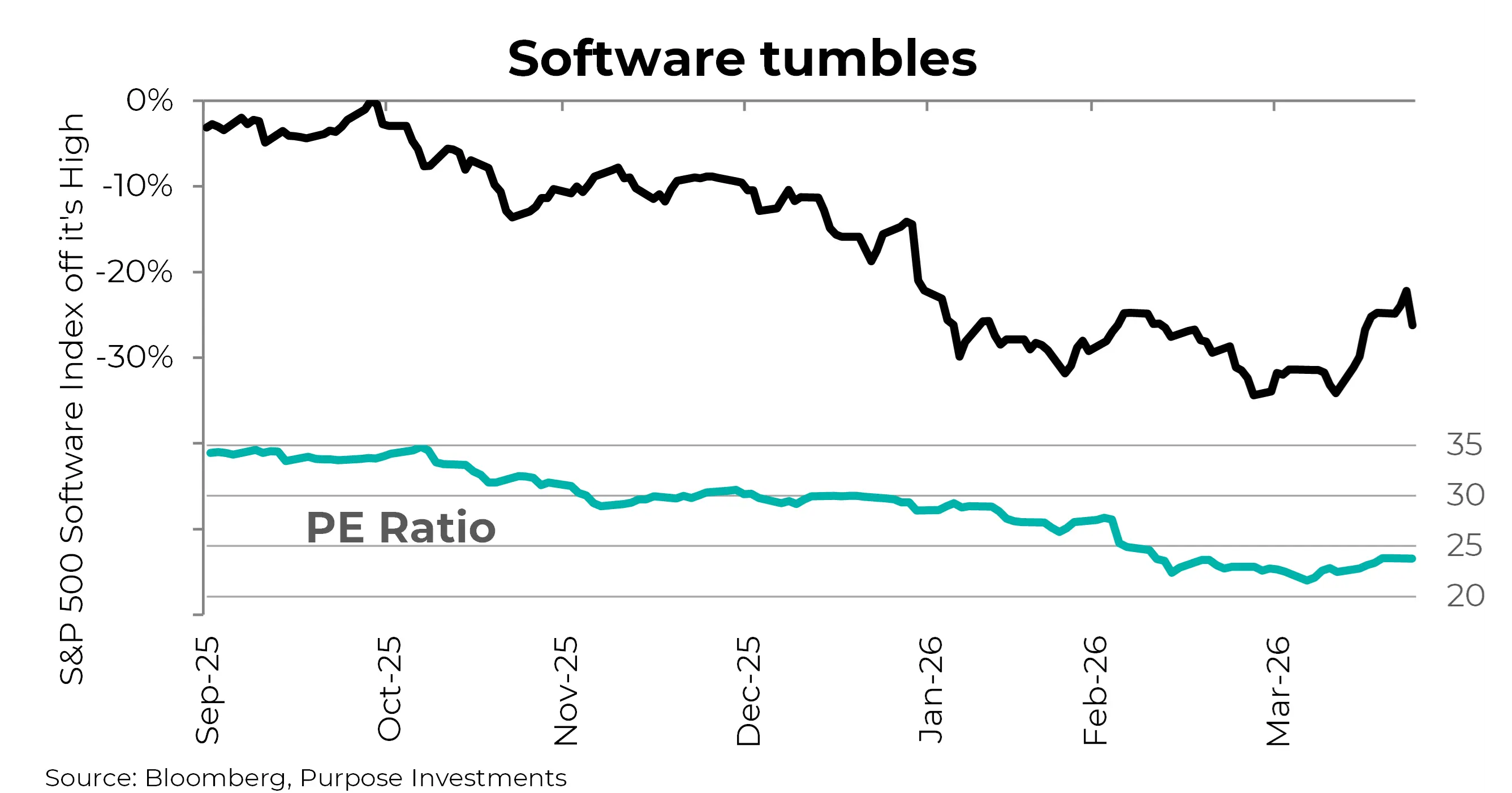 Markets often overreact in the short-term and under react to long-term changes. This does appear to be the short-term overreaction phase. Over the past more than 30 years, there have been very few occasions when software traded at or below the market multiple. In our view, the market reaction may be overdone, though the narrative around software remains negative and this is a narrative-driven market.