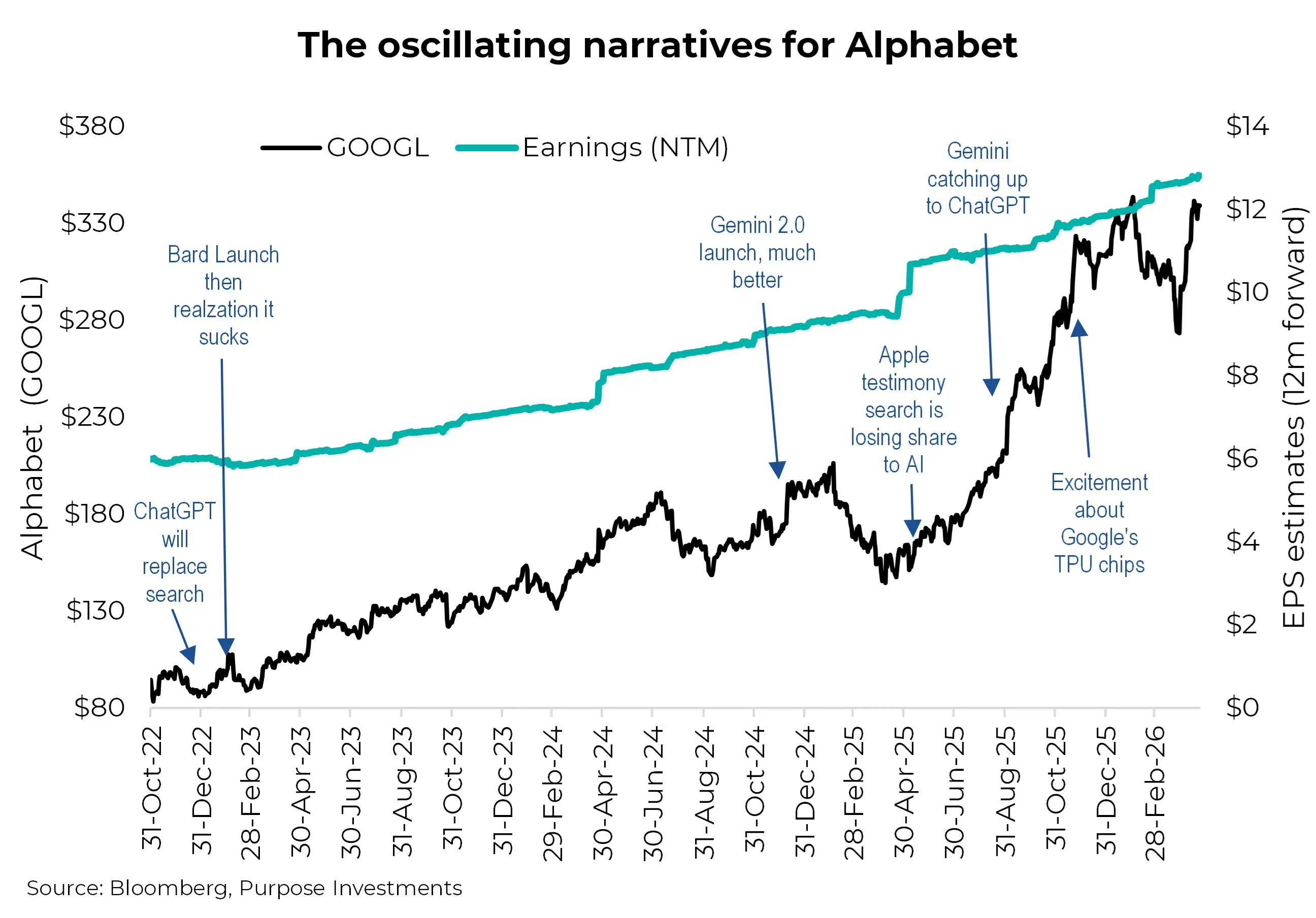 Borrowing an example from a Morgan Stanley conference, the chart below shows the oscillating narratives around Alphabet (Google). Periods of angst are created when the market narrative that AI will replace search makes the rounds. This is countered by AI product launches, from the poorly received Bard to the well received Gemini 2.0. We get a build from excitement that Gemini is closing the market share gap with ChatGPT, followed by the excitement that Alphabet is starting to sell their TPU chips to other providers. Meanwhile, earnings estimates continue to move in a steady line up and to the right. Earnings are what matter long term; narratives drive the short term.
